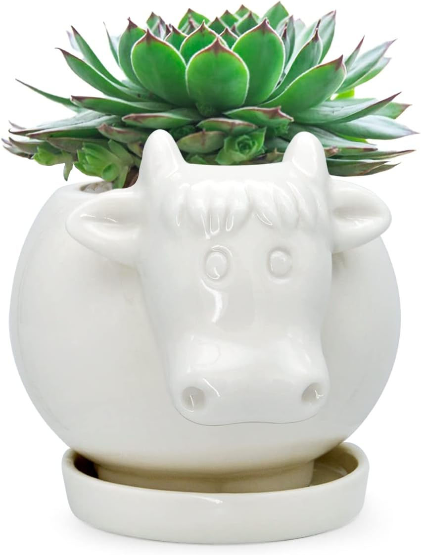 GeLive White Cow Planter, Cute Cartoon Plant Pot, Small Ceramic Succulent Pot,